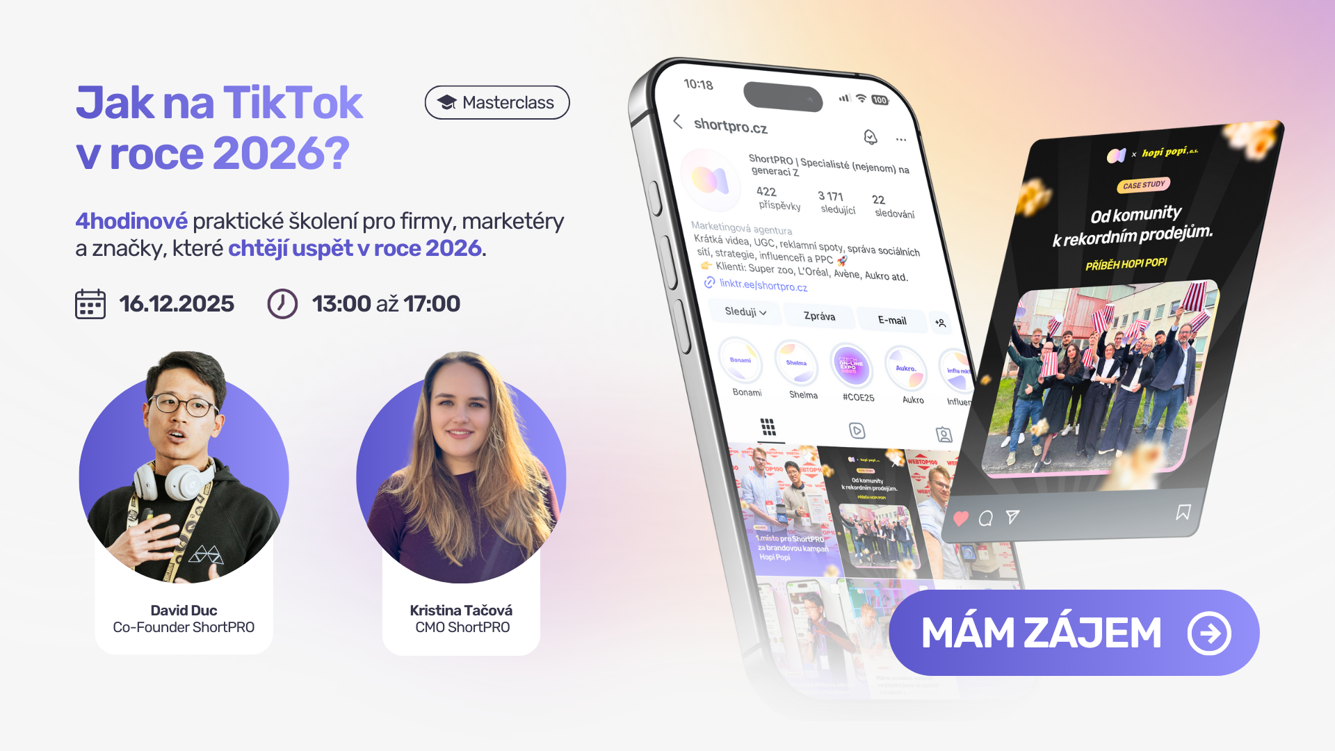 „Školení mohu jen doporučit. David ze ShortPRO je skvělý školitel a do detailů nám ukázal, jak bychom měli postupovat při rozšiřování komunikace naší značky na TikToku. Součástí školení byly nejen strategie a případové studie Davidova klientů, ale také brainstorming a vymýšlení našeho vlastního konceptu a strategie komunikace. Díky tomu máme jasnější představu o tom, jakým směrem se na TikToku chceme vydat, víme přesně jak tuto strategii zaimplementovat, na co se soustředit a čemu se vyhnout.“